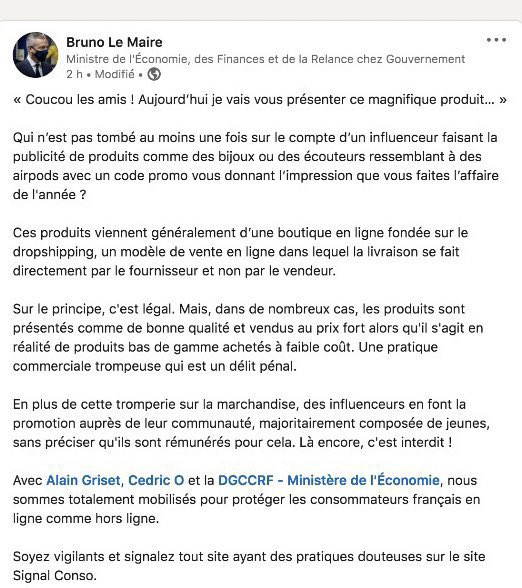 Attention le Dropshipping est dorénavant dans le viseur du Ministère des finances. Bruno Lemaire a récemment twitté : Luttons ensemble contre les pratiques douteuses de certains sites et influenceurs pratiquant le #dropshipping. Soyez vigilants. N’hésitez pas à les signaler sur http://signal.conso.gouv.fr.